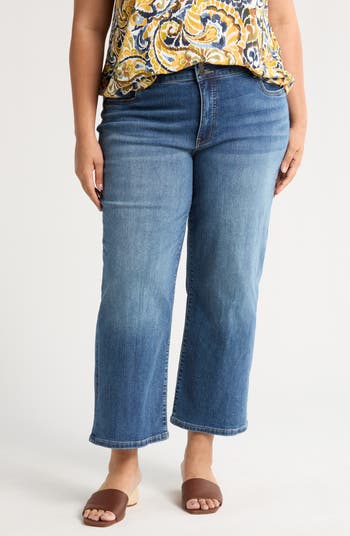 A faded wash brings retro appeal to high-waisted wide-leg jeans cut from soft stretch denim for maximum comfort.