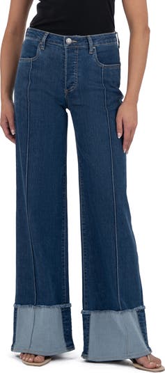 Frayed cuffs highlight the dramatic wide-leg silhouette of these pintucked, full-length jeans made with two hues of indigo stretch denim.