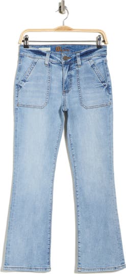 Trendy kick-flare jeans get their laid-back, casual-cool feel from utility pockets and a light wash aged with tacking and fading.