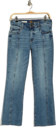 A faded wash and raw hems boost the retro vibe of these mid-rise flare-leg jeans cut in an ankle-skimming silhouette.
