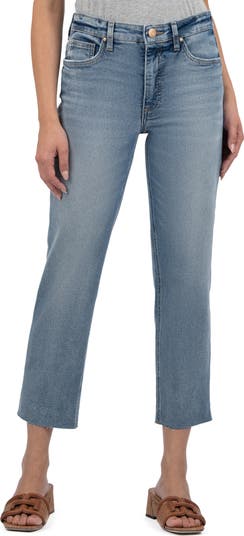 A high waist and slim, tapered-crop legs bring classic '90s style to raw-hem jeans made from faded, whiskered stretch denim for comfort and a well-loved look.