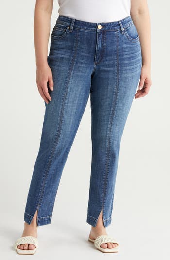 These stretchy, slim-cut straight-leg jeans feature sleek seam details that end in split hems to highlight your footwear.