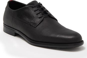 A polished leather upper distinguishes a streamlined derby outfitted with a plain toe and lightweight sole.