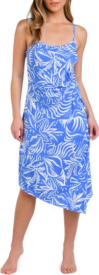 A vibrant tropical print elevates an airy dress featuring a midi length and asymmetric hem.