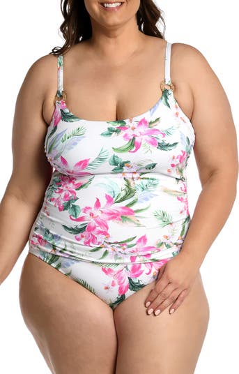 Ruching defines a one-piece swimsuit patterned with tropical flowers for eye-catching appeal.
