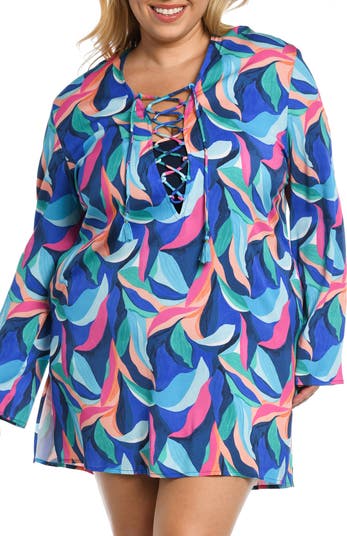 A color-swirl print emboldens this poolside cover-up topped with a laced-up neckline.