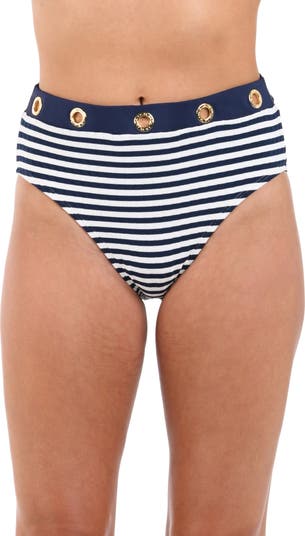 Logo-marked grommets highlight the high waistband on these chic, striped bikini bottoms that offer smoothing support.