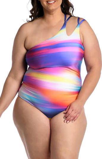 A one-shoulder neckline lends striking sophistication to this vibrant one-piece swimsuit complete with side shirring and tummy control.
