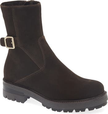 A round toe and chunky lug sole balance a buttery suede bootie fashioned with a buckled and side zipper for easy entry.