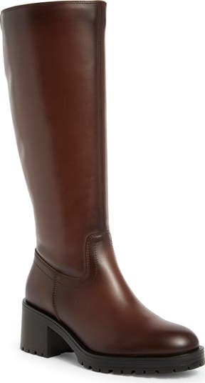 Burnished leather adds a well-aged appeal to a tall boot furnished with a well-cushioned footbed and chunky block heel to support your step.