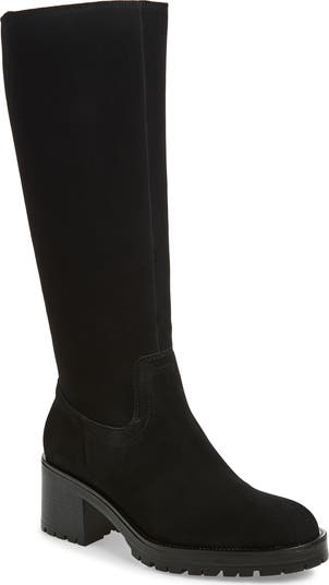 Burnished leather adds a well-aged appeal to a tall boot furnished with a well-cushioned footbed and chunky block heel to support your step.