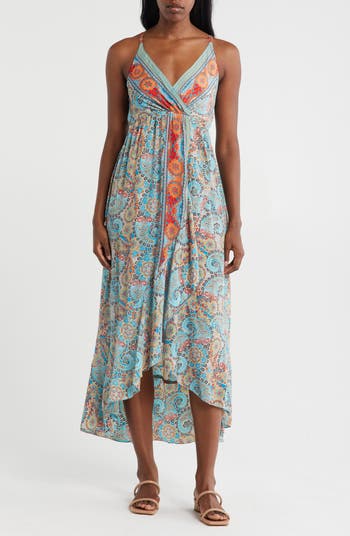 A vibrant paisley print enriches the boho-chic vibe of a lightweight maxi dress fashioned with an Empire waist and ruffled high-low hem.