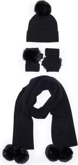 Stay toasty when the temps drop with this fabulous faux fur accessory set complete with a pompom-adorned beanie, scarf and gloves.