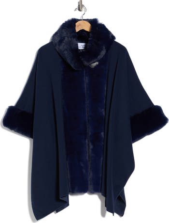 Fluffy faux-fur trim lends glamorous appeal to this brushed ruana finished with a toggle closure.
