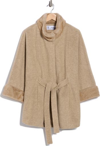 Fluffy faux fur elegantly trims this toasty wool-kissed cape finished with a tie belt.