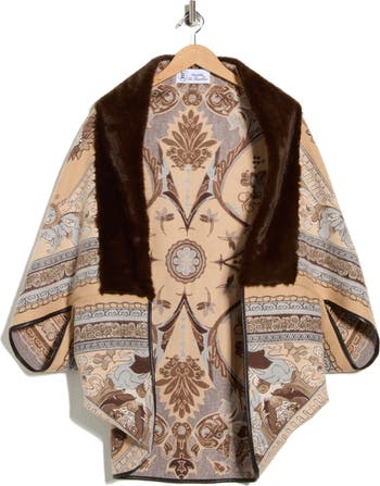 Fluffy faux fur trims the shawl collar of this chic cocoon of a cape crafted from ornate jacquard fabric and finished with faux leather trim at the sleeves.