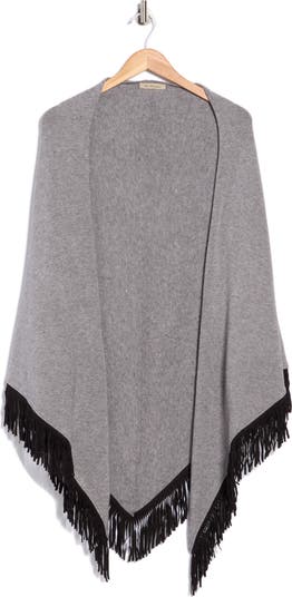 Contrast fringe trims this cozy ruana for a statement layer on chilly days.