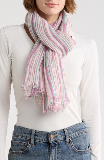 Colorful horizontal stripes define this linen scarf adding a pop of color to your look.