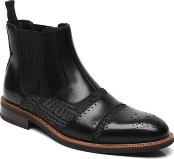 Exude polished style in this brogued leather- and herringbone-paneled Chelsea boot framed by a medallion cap toe and a durable nonslip sole.