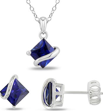 An elegant swirl secures the settings of the radiant lab-grown sapphires that define this set complete with stud earrings and a matching necklace.