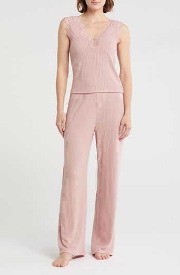 Snooze or lounge comfortably in this soft ribbed pajama set including a romantic lace-trimmed tank and coordinating pants.