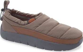 For extra comfort catching flights or recovering from the day, these high-tech slippers feature rip-stop nylon quilting, a dense, well-cushioned footbed and durable grip sole for indoor and outdoor wear.