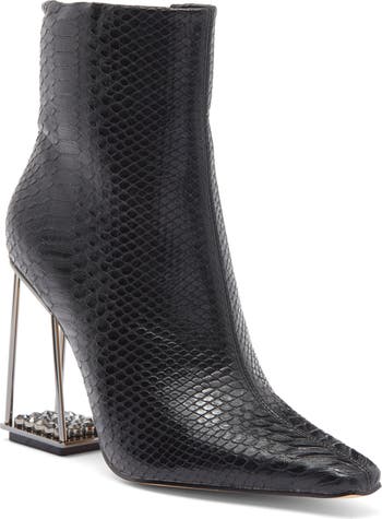 An architectural heel brings visual intrigue to this pointy-toe bootie that's fashioned from snakeskin-embossed faux leather.