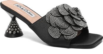 Make a show-stopping entrance in this square-toe slide sandal featuring a three-dimensional floral appliqué accent and set on an inverted geometric heel with a dazzling crystal embellishments.