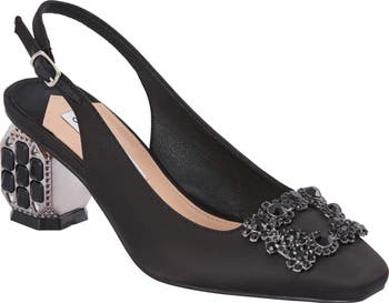 Embellishments at the heel and toe add to the drama of this sophisticated slingback pump made for modern styling with its sleek, squared toe.
