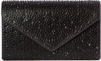 A silhouette brings versatile appeal to a gleaming rhinestone-covered envelope clutch. A secure magnetic closure and optional chain strap is just right for your next night out.