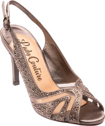 Dainty rhinestones dazzle along the elegant open toe of a slingback sandal set with a spike heel.