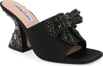 A crystal-embellished bow and sculptural heel bring the drama to this elegant satin mule meant to take center stage of any event.