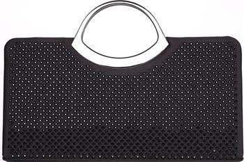 Make a statement with this sophisticated evening bag showcasing a structured silhouette covered in sparkling rhinestones over sumptuous satin.