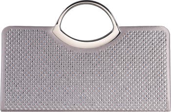 Make a statement with this sophisticated evening bag showcasing a structured silhouette covered in sparkling rhinestones over sumptuous satin.