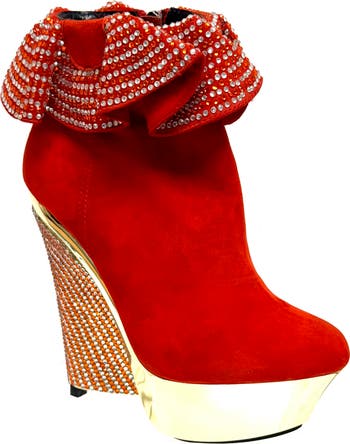 A rhinestone-encrusted wedge and collar add dramatic detailing to this slender suede bootie lofted by a contrasting metallic platform.