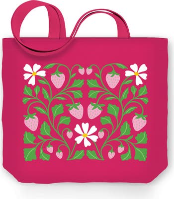Vibrant strawberries sprawl over the front of this colorful canvas tote that's perfect for market days.