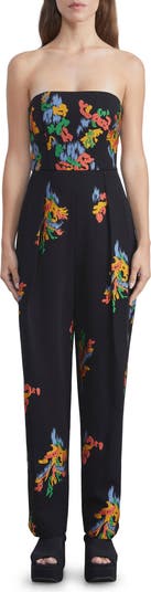 The label's striking Floral Frost motif rendered in fil coupé jacquard transforms this boned-bodice strapless jumpsuit into a wearable work of art.