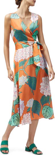 A spring-fresh hydrangea print and a soft tangerine hue lend a striking look to this silky midi dress with an attitude of luxe, modern ease.