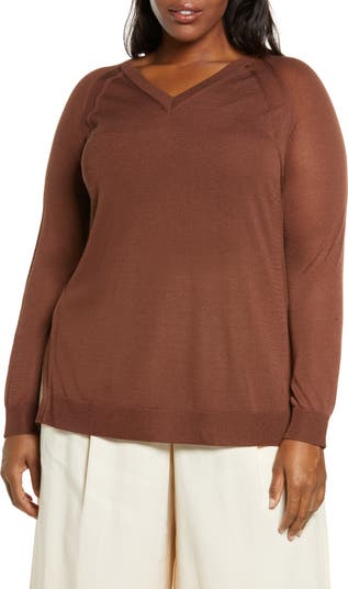 Sheer panels skim the sides and sleeves of this silk-kissed sweater rendered in a rich copper hue.