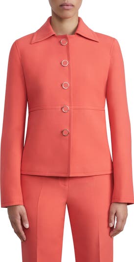 A seam at the waist draws attention to the nipped-in tailoring of a wool and silk blazer with exquisite details like widened topstitching and enameled buttons.