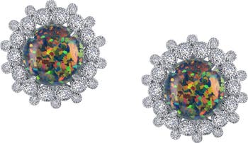 A round-cut simulated black opal with a sparkling halo brings glamorous shine to some studs crafted from polished sterling silver.