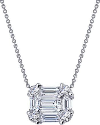 A simulated-diamond baguette is haloed by round stones, creating a pendant with stunning sparkle suspended from a delicate sterling silver chain.
