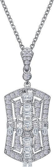 Baguette-cut and round simulated diamonds bring glamorous sparkle to this vintage-inspired pendant necklace crafted from platinum-bonded sterling silver.