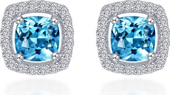 A cushion-cut simulated stone with a sparkling halo brings glamorous shine to some studs crafted from polished sterling silver.