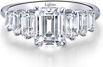 Graduated emerald-cut simulated diamonds illuminate this glamorous seven-stone ring crafted from platinum-bonded sterling silver.