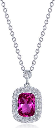 A sparkly simulated diamond halo frames a stunning lab-grown purple sapphire on this elegant necklace crafted from platinum-bonded sterling silver.