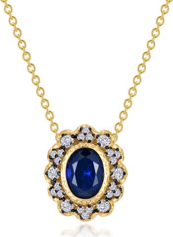 A delicate chain necklace centered by an oval-shaped pendant adorned with simulated diamonds and lab-grown sapphires is a perfect way to bring elegance to special-occasion looks.
