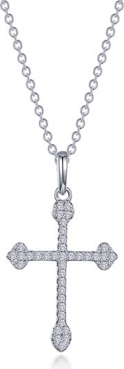 Prong-set simulated diamonds form the cross-shaped pendant of an elegant necklace made from sterling silver bonded with platinum.