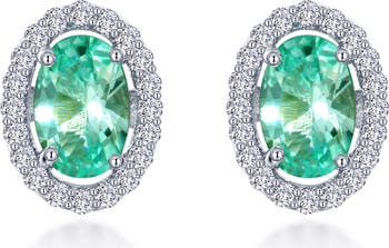 Sparkly simulated-diamond halos frame oval-cut lab-grown green sapphires on these glamorous stud earrings crafted from platinum-bonded sterling silver.