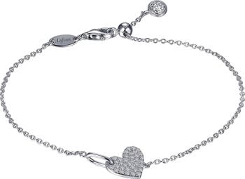 An oval link pierces through a delicate heart charm that sparkles with dazzling pavé-set simulated diamonds on this adjustable chain bracelet.
